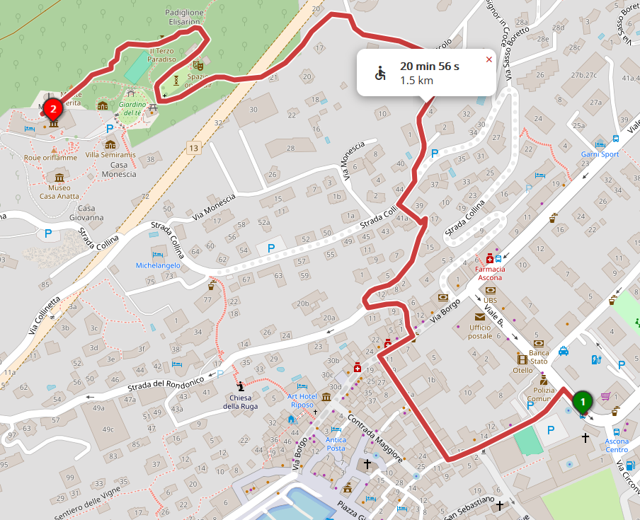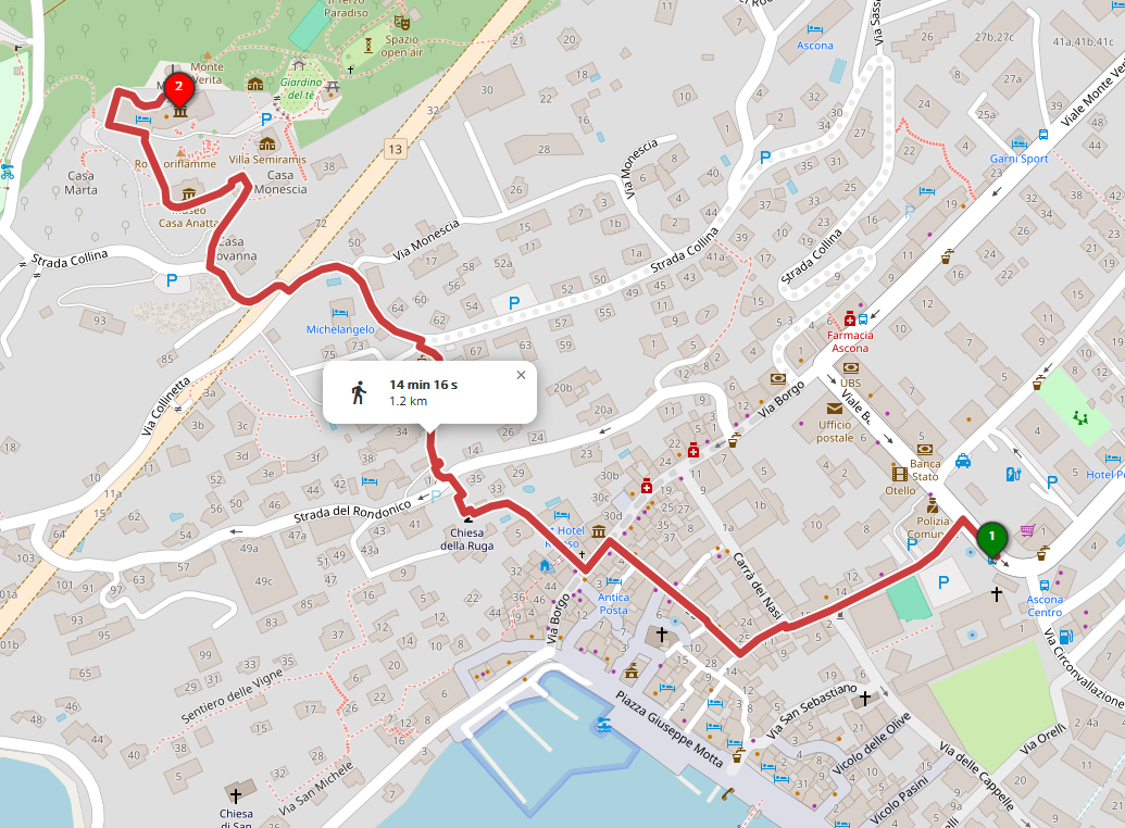 From Ascona Centro to Monte Verità it is about 1.3km and it goes up around 140m in altitude: